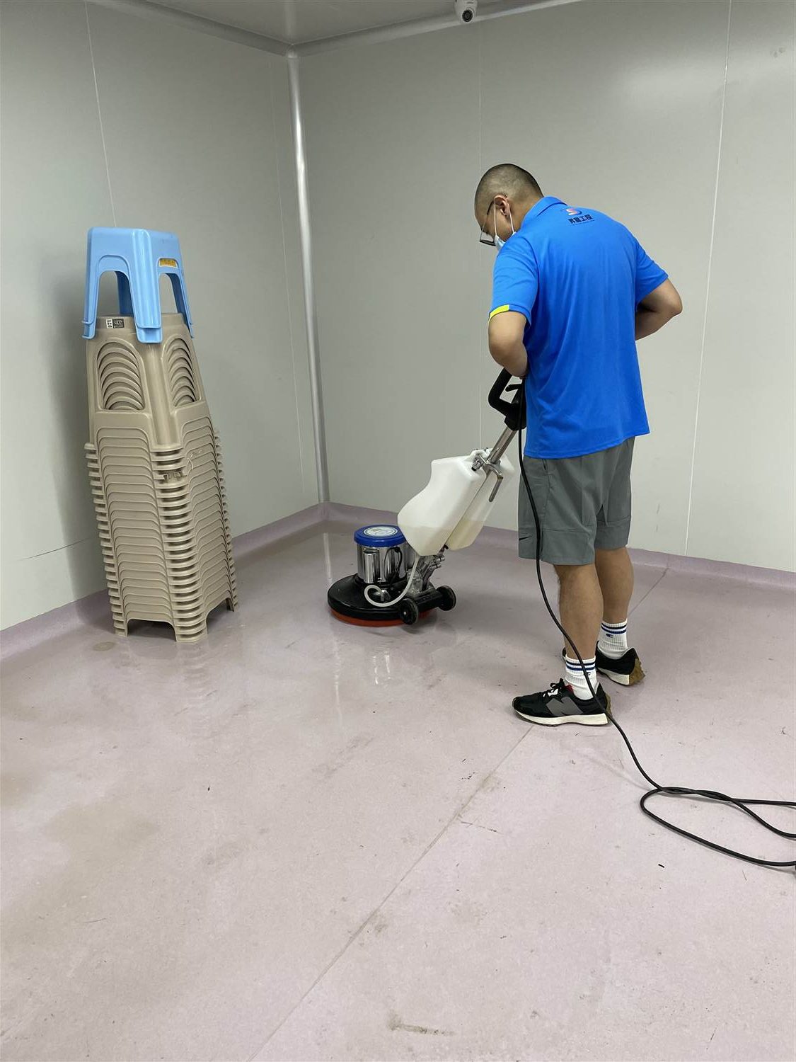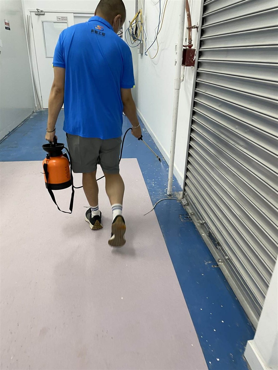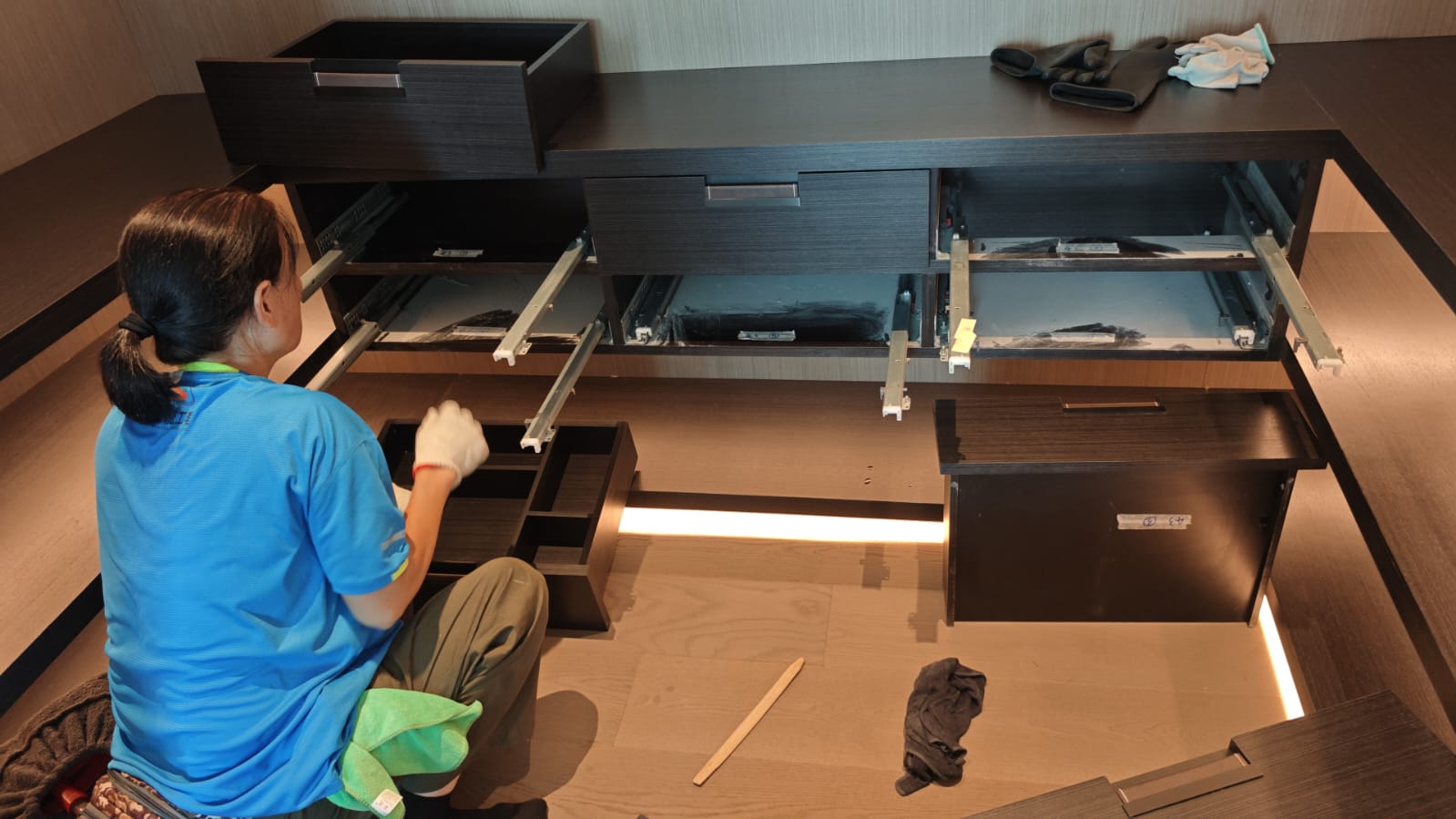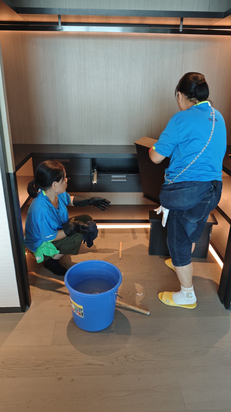 - 工業 HEPA 吸塵器處理牆面、天花、地面、櫃內、電線槽、窗軌與踢腳線。
